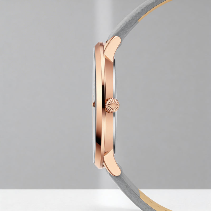 Rose gold analog watch with gray Roman numeral dial, day-date display, and gray leather strap