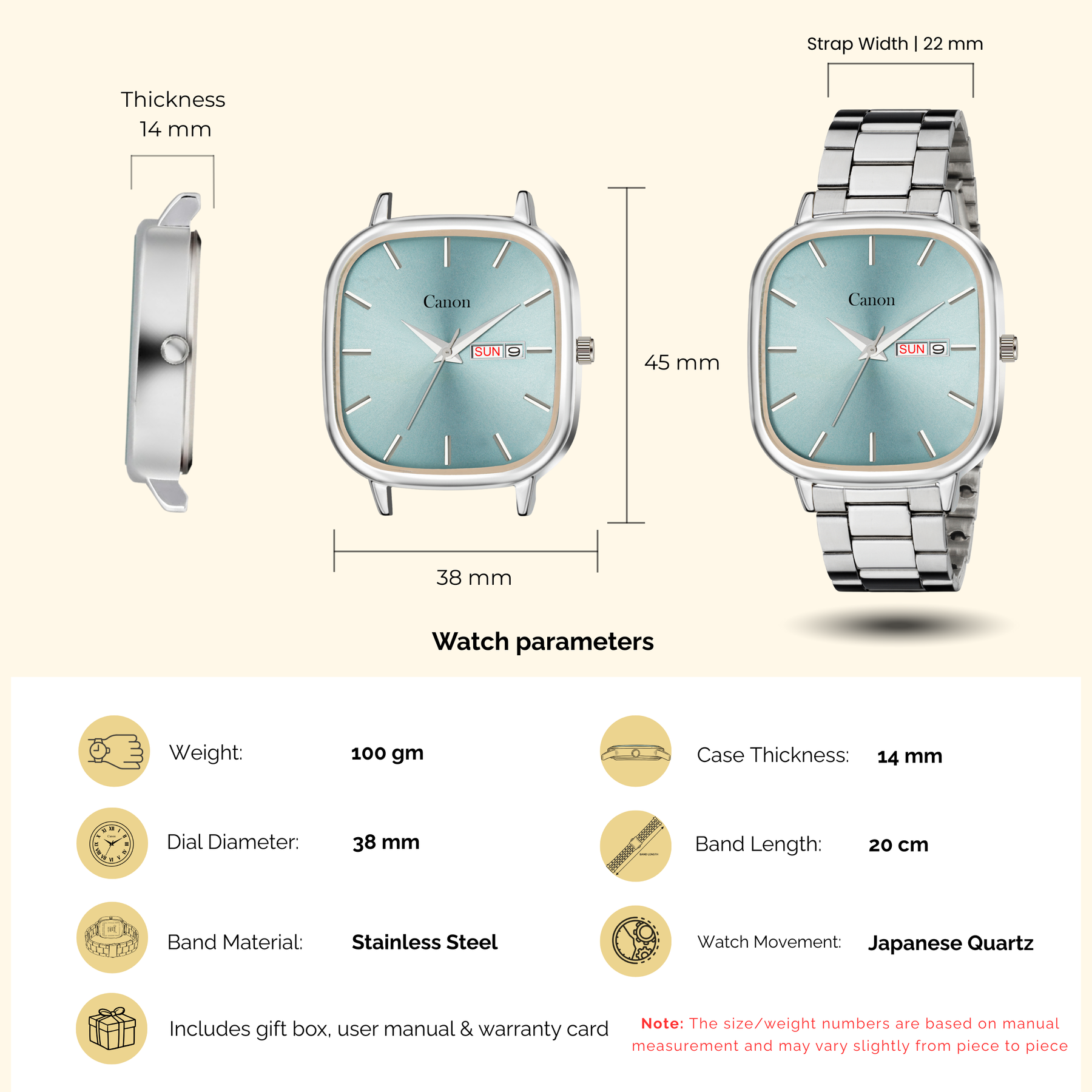 In summary, the Canon Quartz Lucid Collection provides a fresh, modern twist on classic watch design. It combines a unique soft-square silhouette with a calming Ice Blue Watch sunburst dial. The Day & Date complication and durable stainless steel build make it versatile and functional. Powered by reliable Japanese quartz precision, this watch is an excellent choice for those valuing clarity, style, and everyday utility. Define your time with clarity. Wear Lucid.