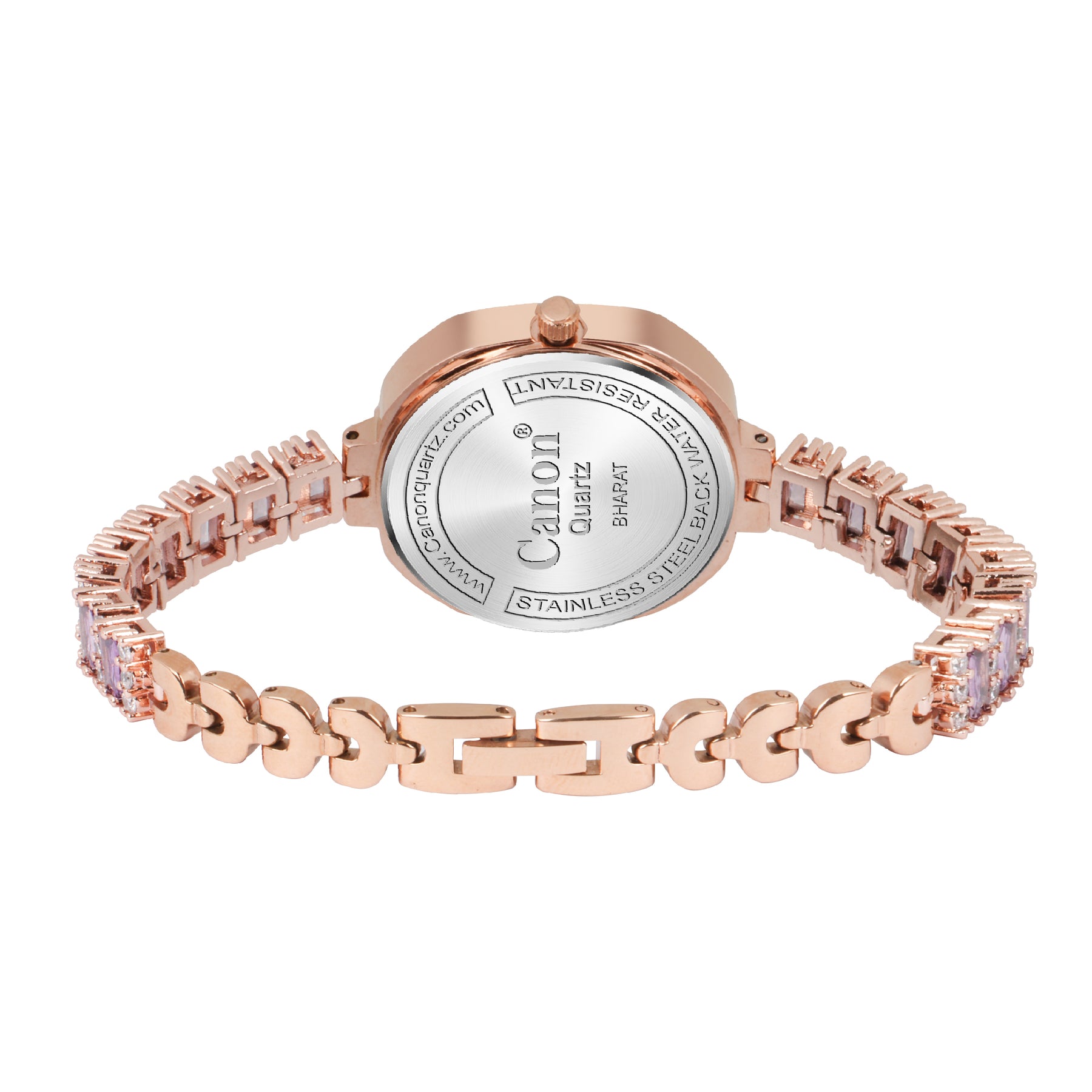A. Its durable rose-gold tone finish makes it suitable for daily elegance, while the crystal-studded bracelet makes it perfect for weddings and parties.