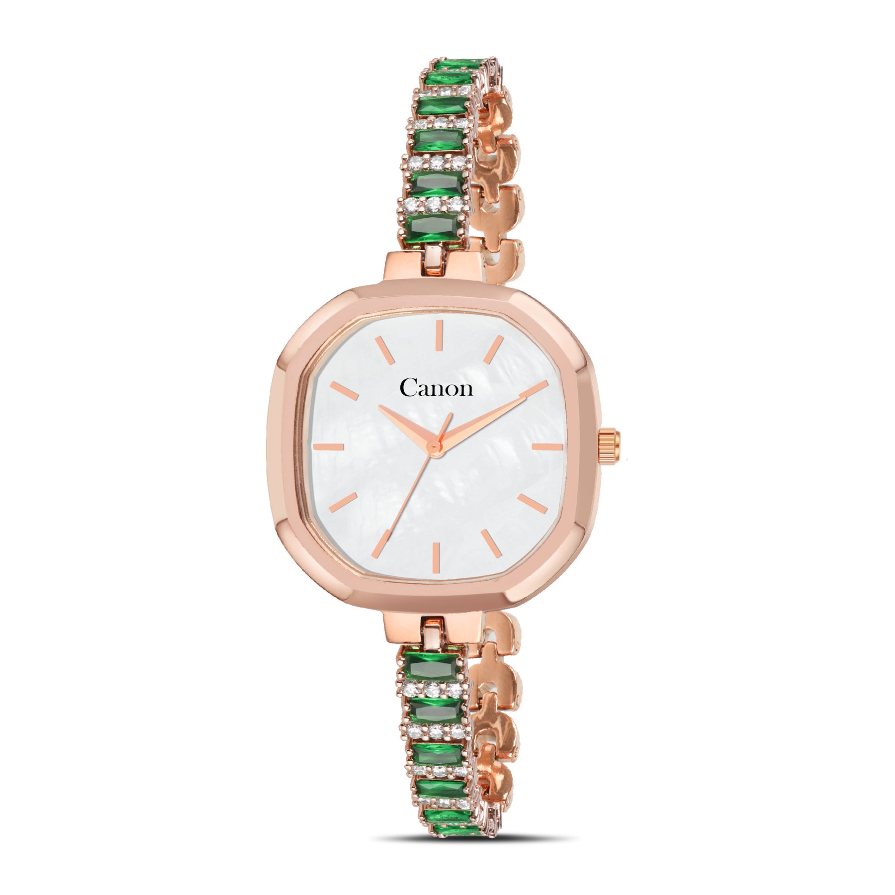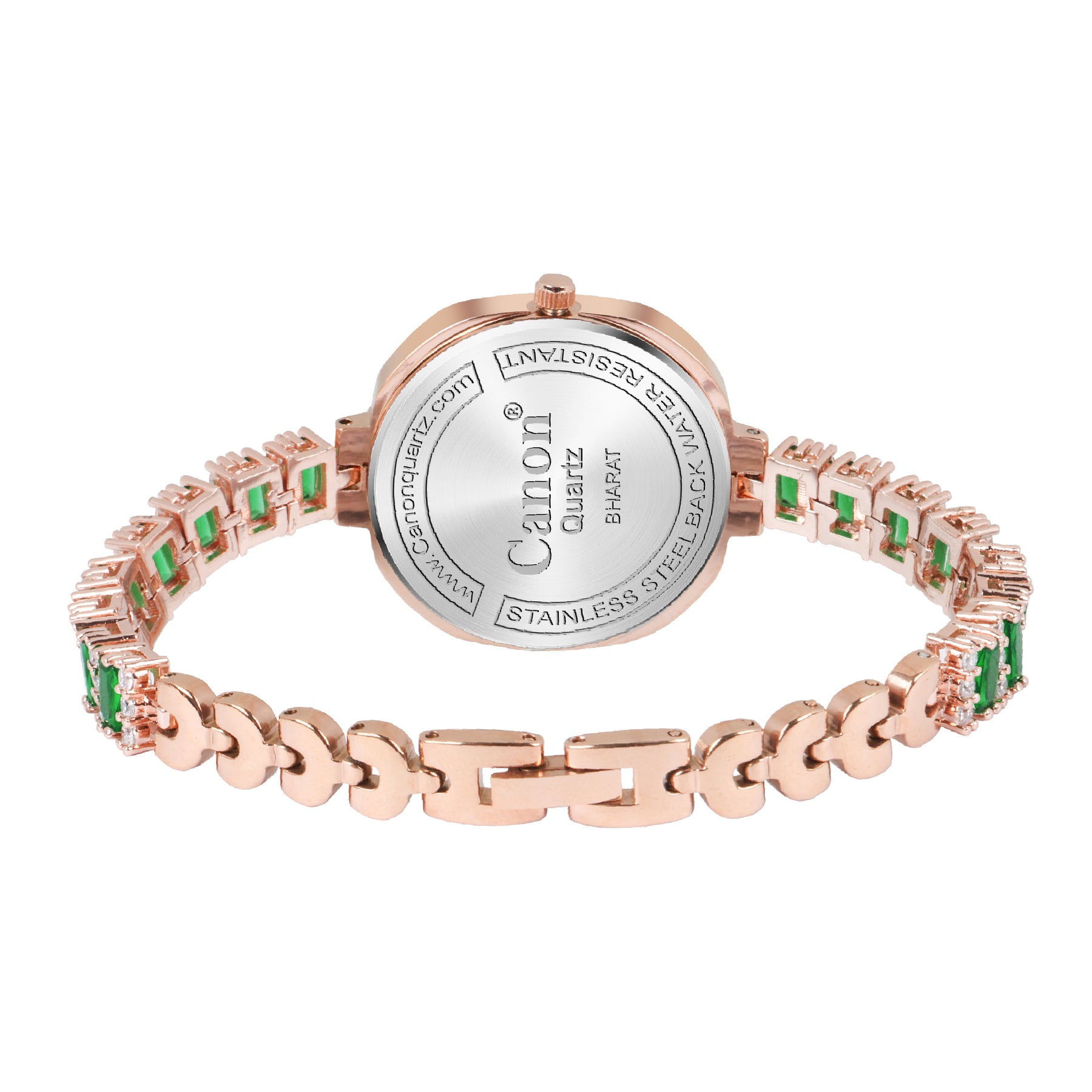 Emerald Gemstone Bracelet: This jewellery watch for women is elevated by a stunning bracelet set with emerald green baguette-cut stones and sparkling crystal accents. The bracelet adds a bold splash of color and shimmer, making this timepiece a spectacular statement piece.