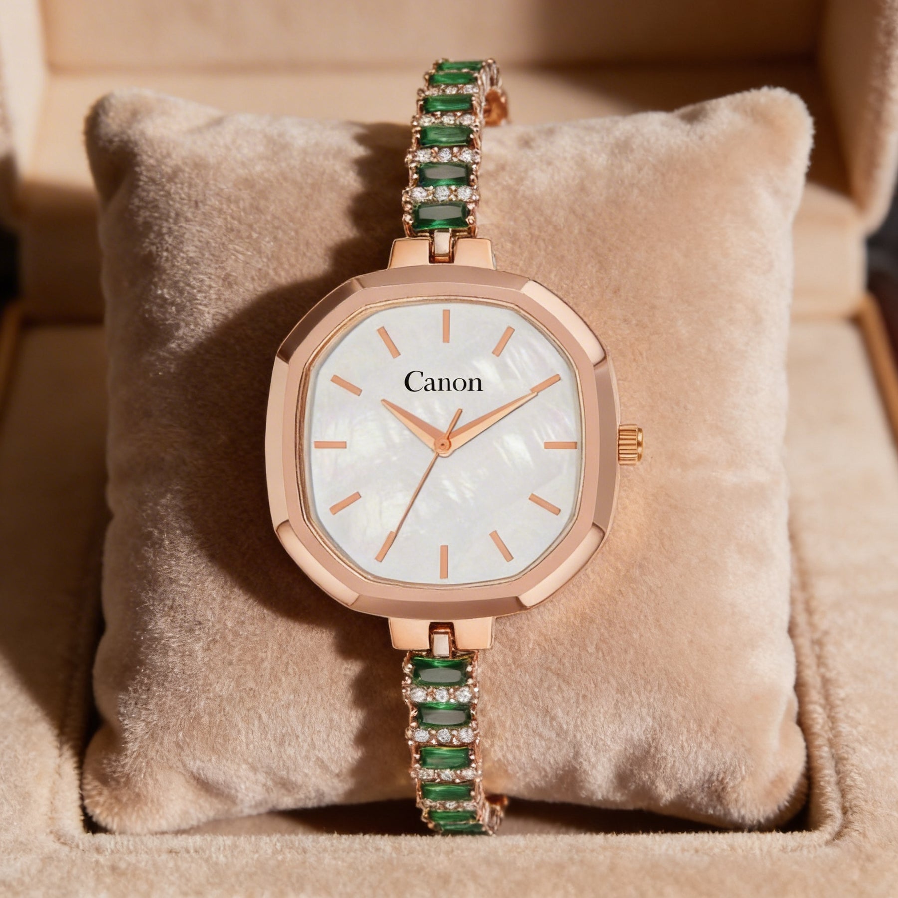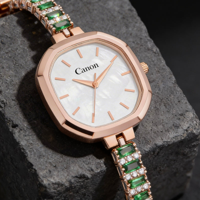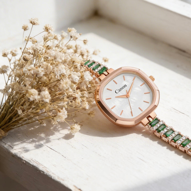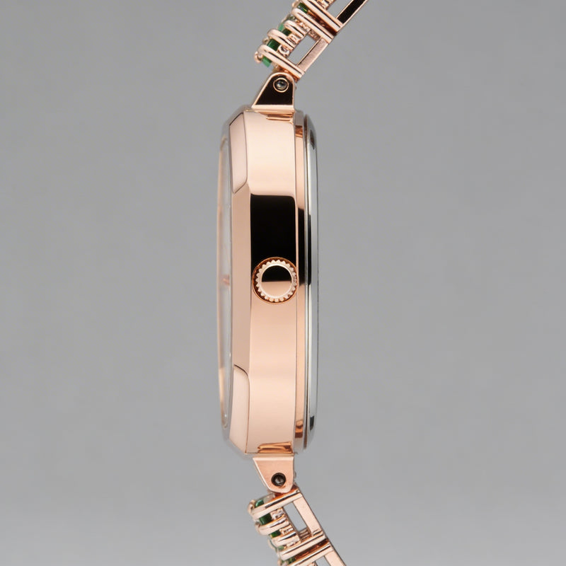 This exquisite timepiece fits perfectly within many ensembles, from traditional attire to modern outfits. It’s ideal for special occasions or as a meaningful gift combining beauty and function. The watch’s rose gold, pearl white, and emerald green speaks to refined taste and elegance.