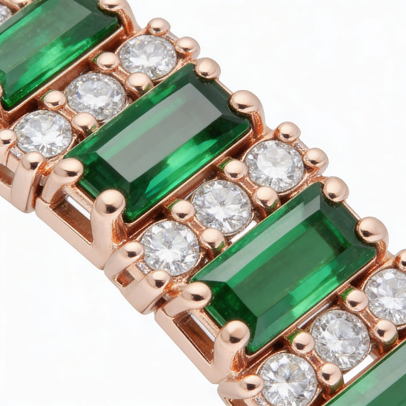 A. This model pairs a luminous pearl-white dial with a jewellery-inspired bracelet featuring striking emerald green baguette-cut stones.