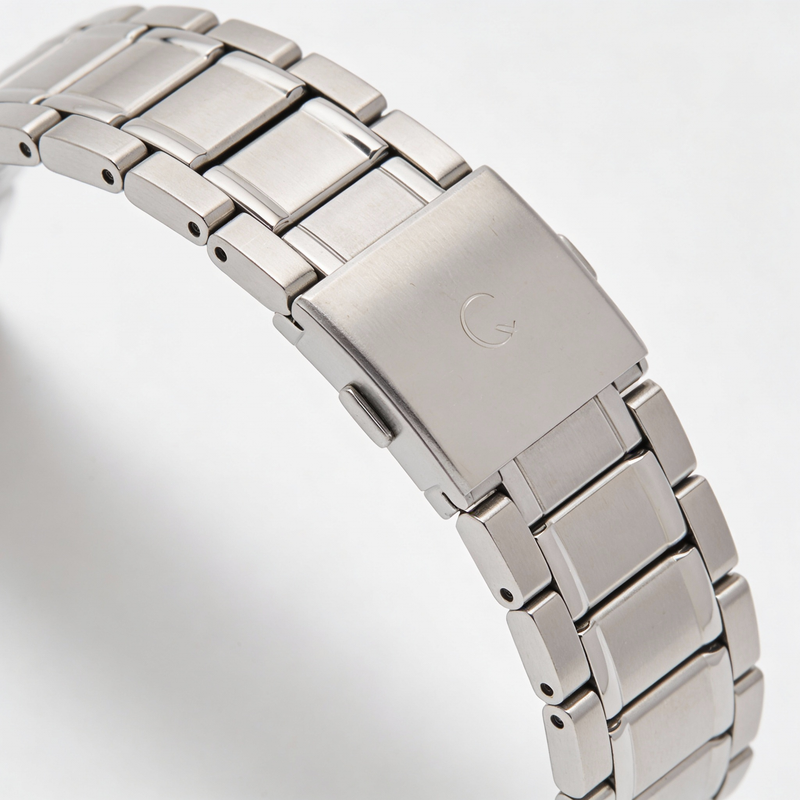 The Sports Bracelet: The solid stainless steel bracelet features a 3-link design that balances flexibility with strength, secured by a double-locking deployment clasp for peace of mind during intense activity.