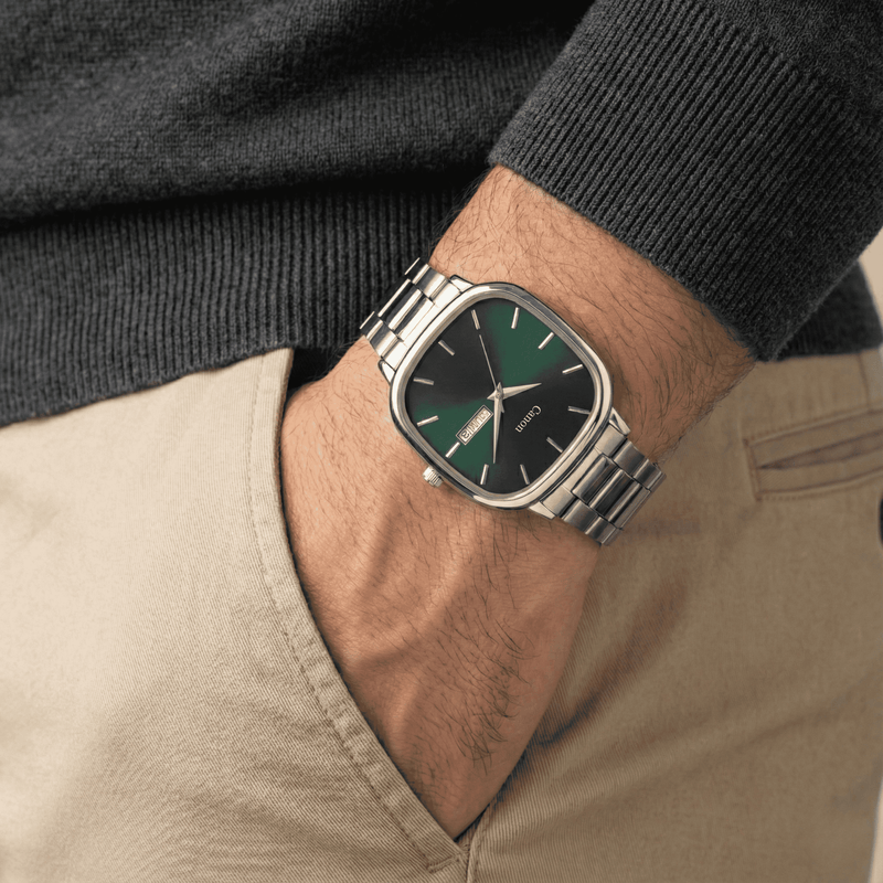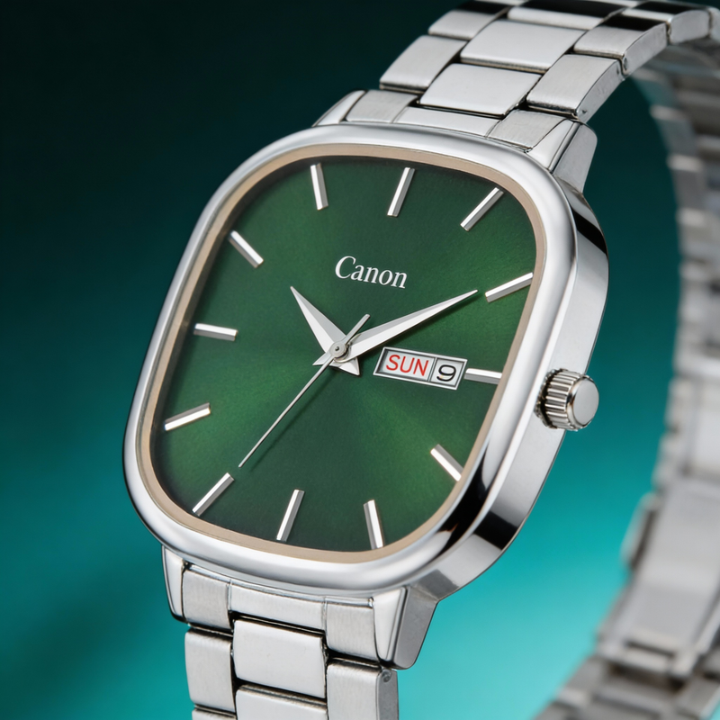 Elevate your daily ambition with the Canon Green Sunburst Watch from the Quartz Lucid Collection. The mesmerizing Deep Forest Green Sunburst dial creates instant clarity in every crucial meeting. Cased in a subtle soft-square silver frame, this Green Sunburst Watch is essential for the professional who believes in quiet luxury and grounded success. This unique timepiece balances heritage with modernity, offering a style that stands apart from the usual round dial watches.