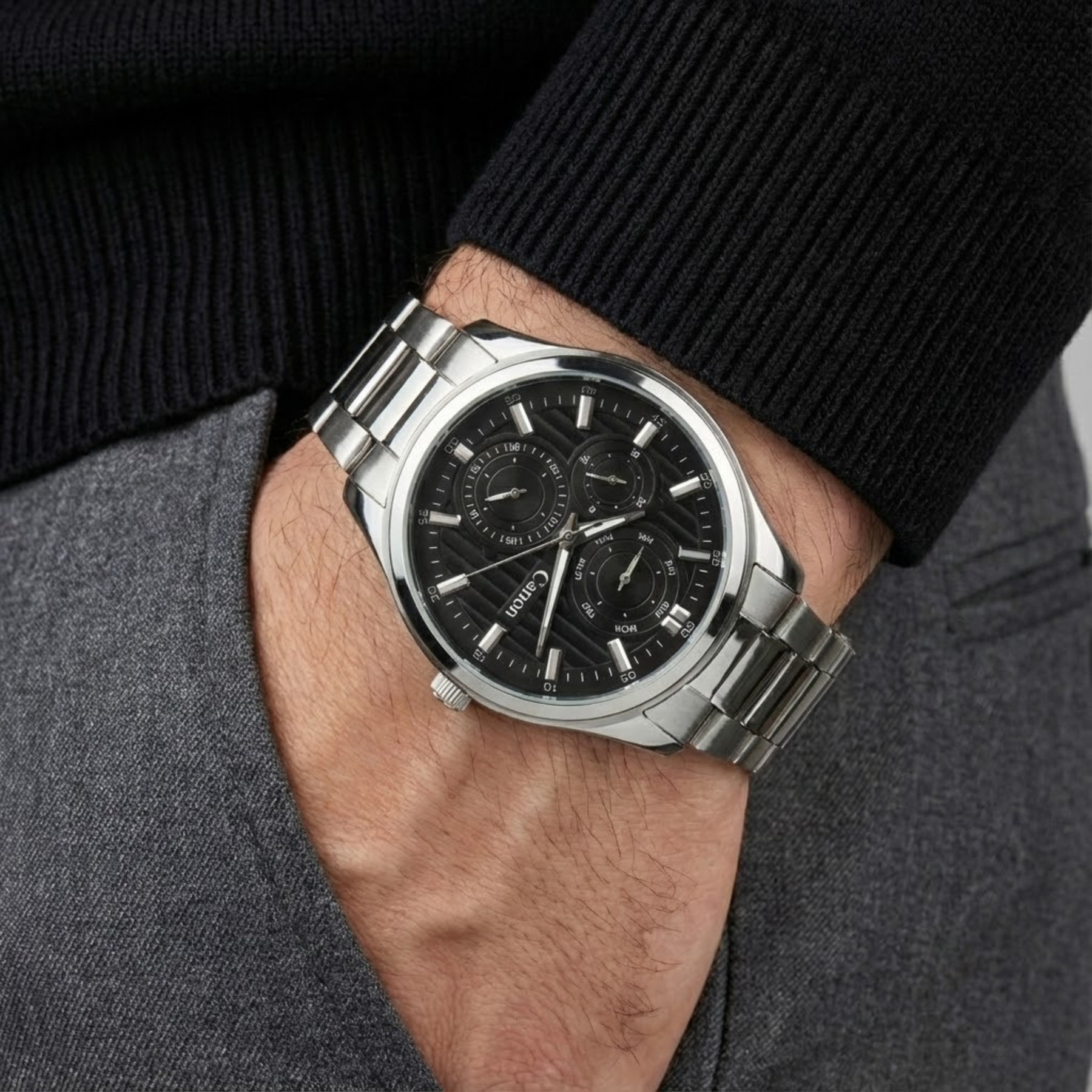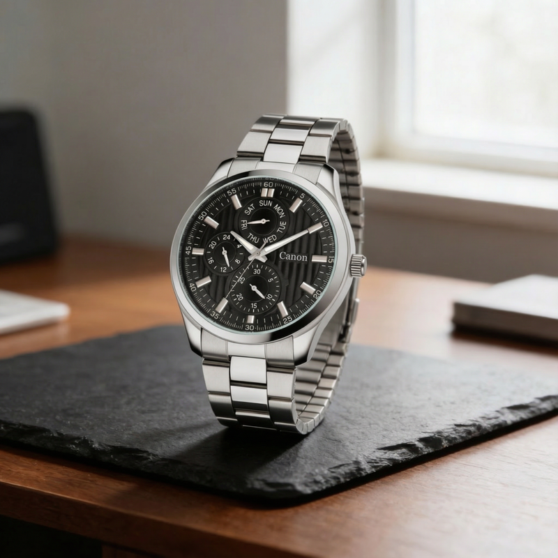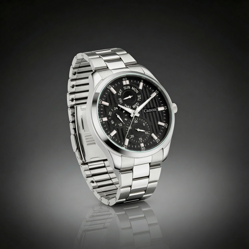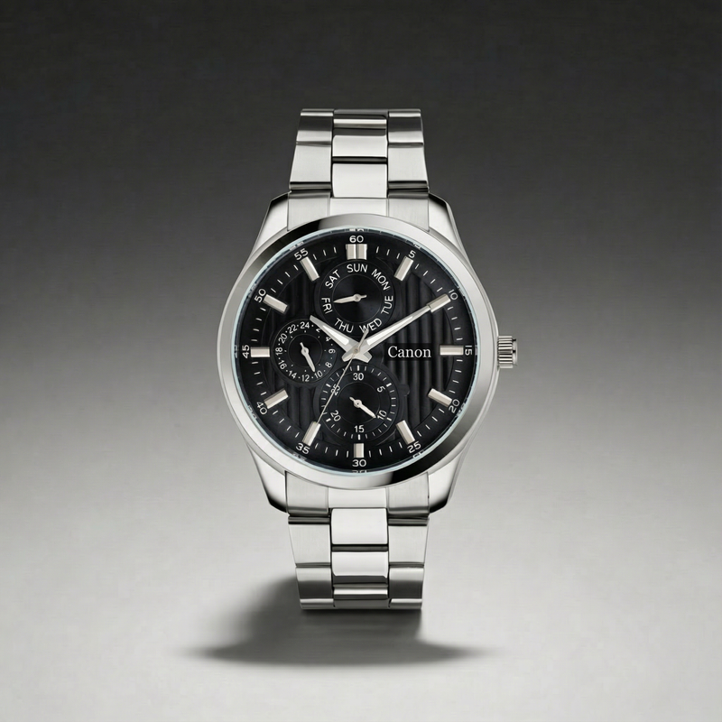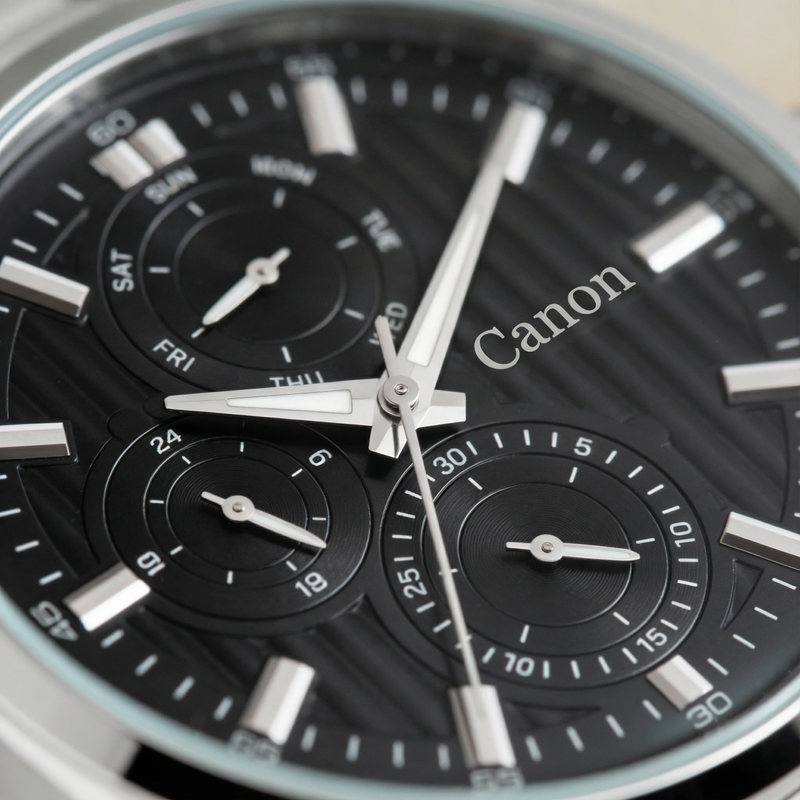 Introducing The Dominion Black, the most commanding men's black watch in the Canon Quartz Dominion Series. This watch is designed for the man who leads from the front. It combines the timeless power of a Jet Black dial with the brilliant contrast of polished silver stainless steel.