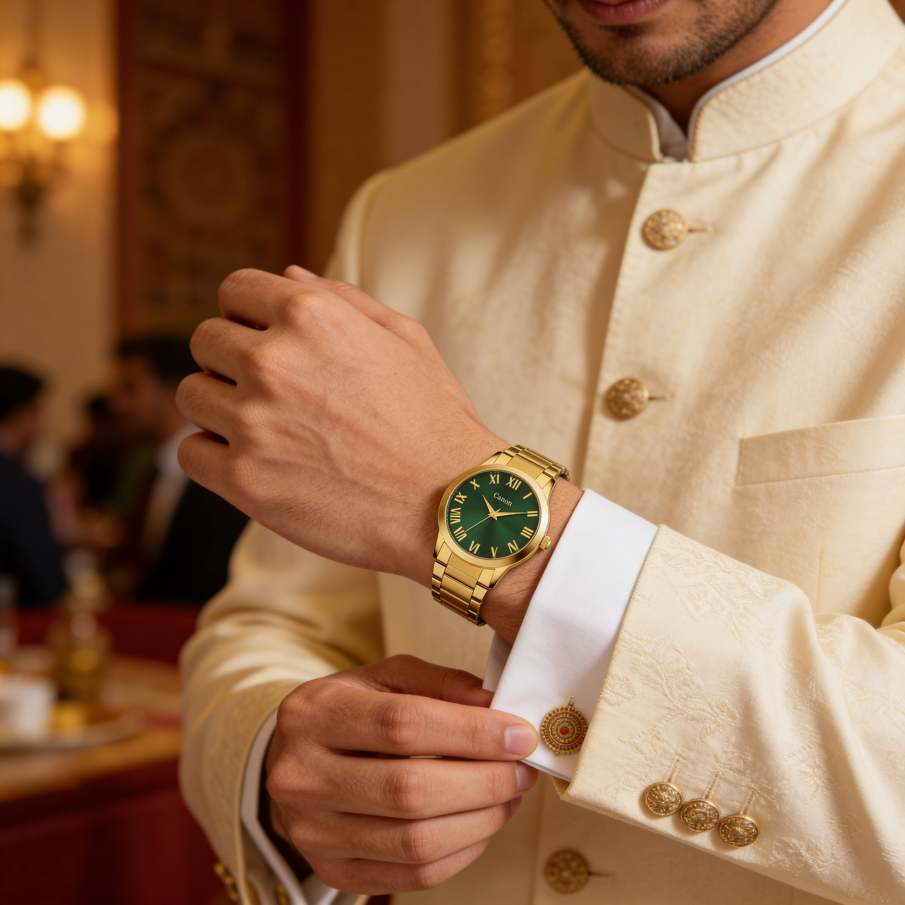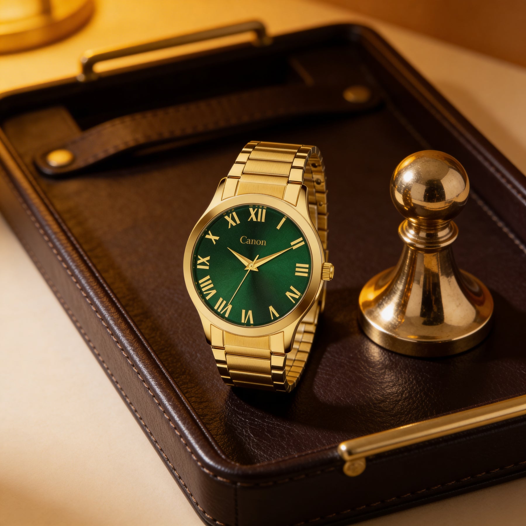 The Canon Quartz Roman dial watch CN-297 redefines what it means to express elegance. Each glance at the expertly constructed dial and polished gold surface reveals ambition and classic taste. The play of green and gold on your wrist makes it impossible to ignore, ensuring you’re always the focus of admiration.