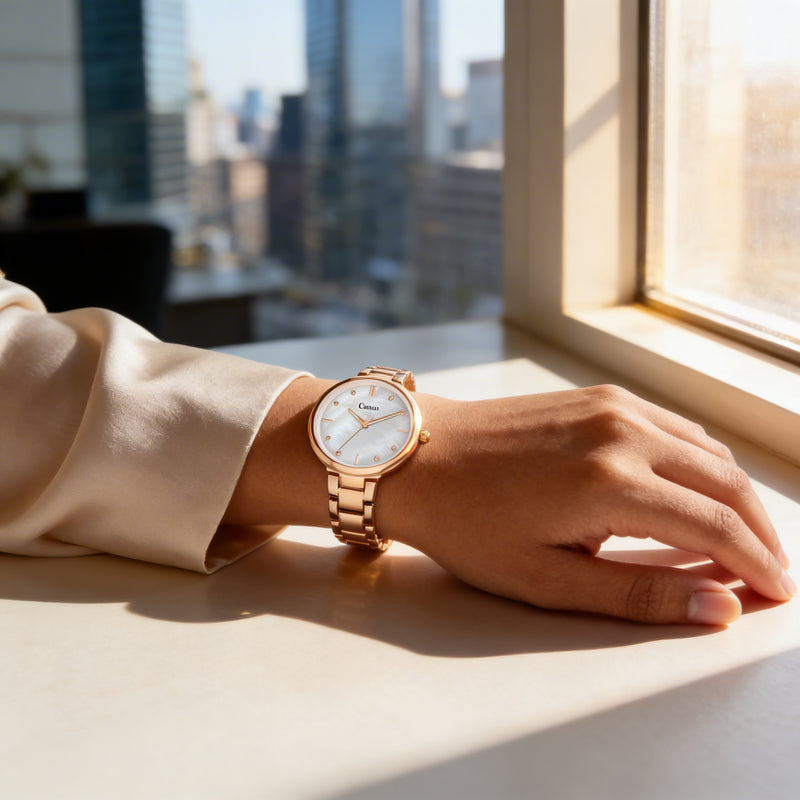 A: It is a timeless classic. While mother-of-pearl is a luxury trend, the simple dial design and rose-gold finish ensure it never looks outdated. You'll wear this for decades.