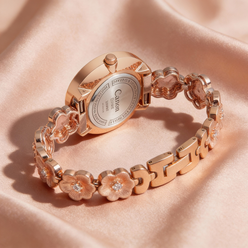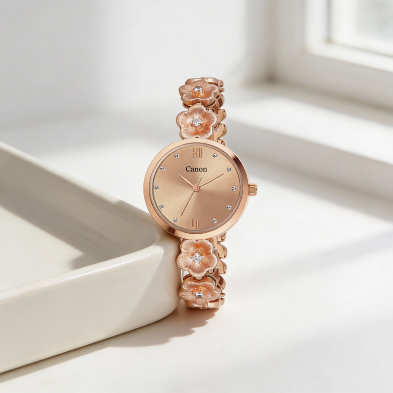 Explore the Canon Quartz Serenite Rose Gold Women's Watch today and adorn your wrist with elegance. Celebrate your unique style with this captivating rose gold floral accessory. Experience the joy of wearing a watch that reflects pure, feminine grace. Make every moment special with Canon Quartz while staying mindful of the gold price today.