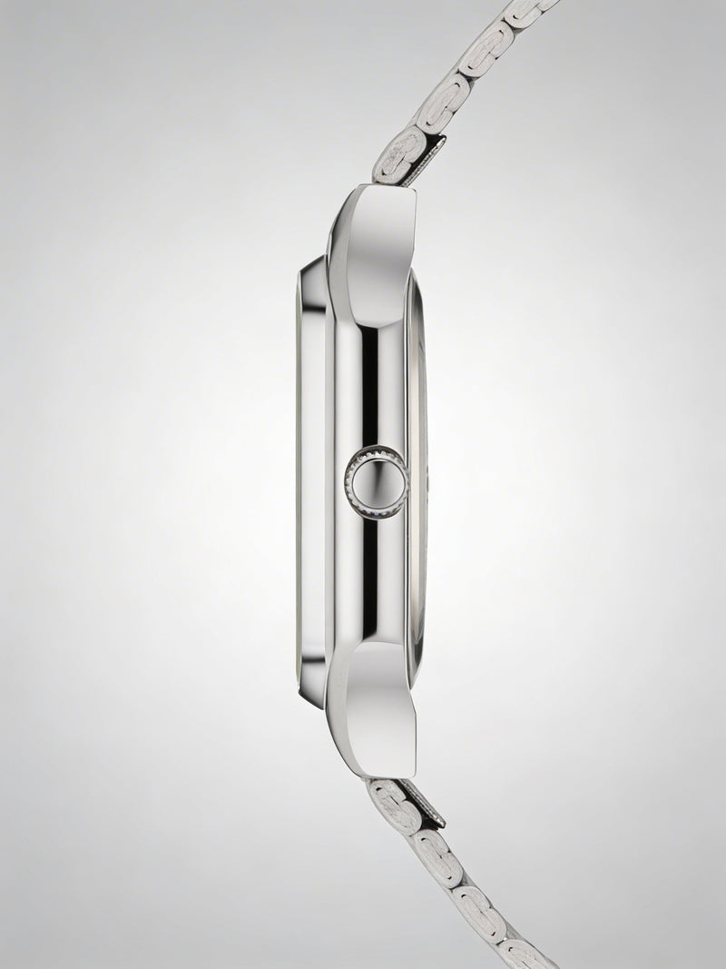 The white dial stands out crisply against the seamless background, making it easy to read at a glance. It is housed in a unique, geometric silver-tone case that pays homage to mid-century design. This geometric case creates a subtle yet attractive silhouette on the wrist that draws attention without overwhelming.