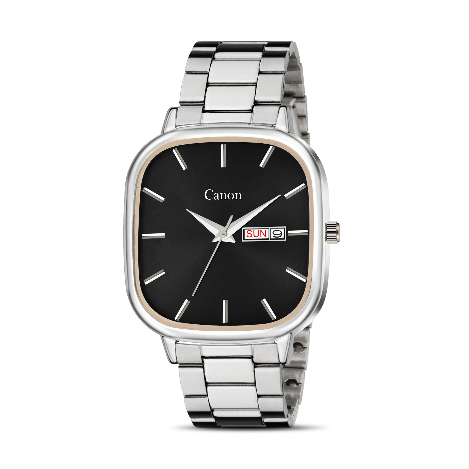 Canon branded silver metal wristwatch with square black dial and day-date display