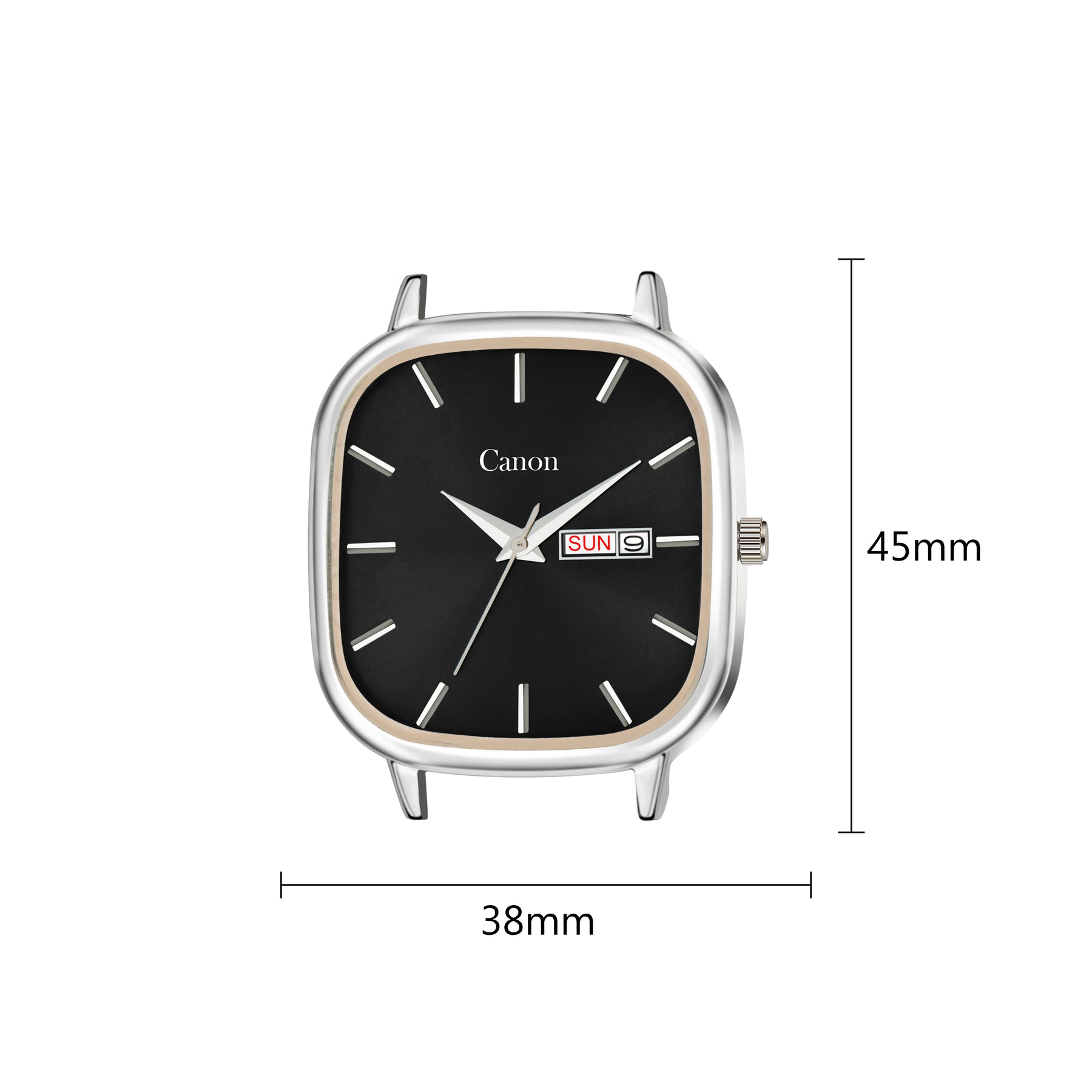 Canon watch face with black dial, silver markers, day-date window, 45mm by 38mm size