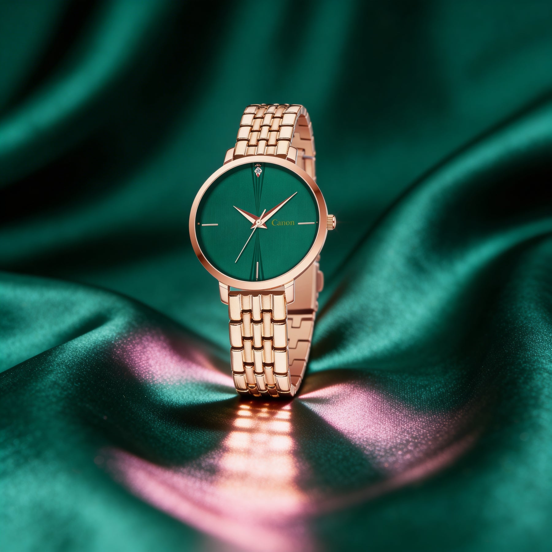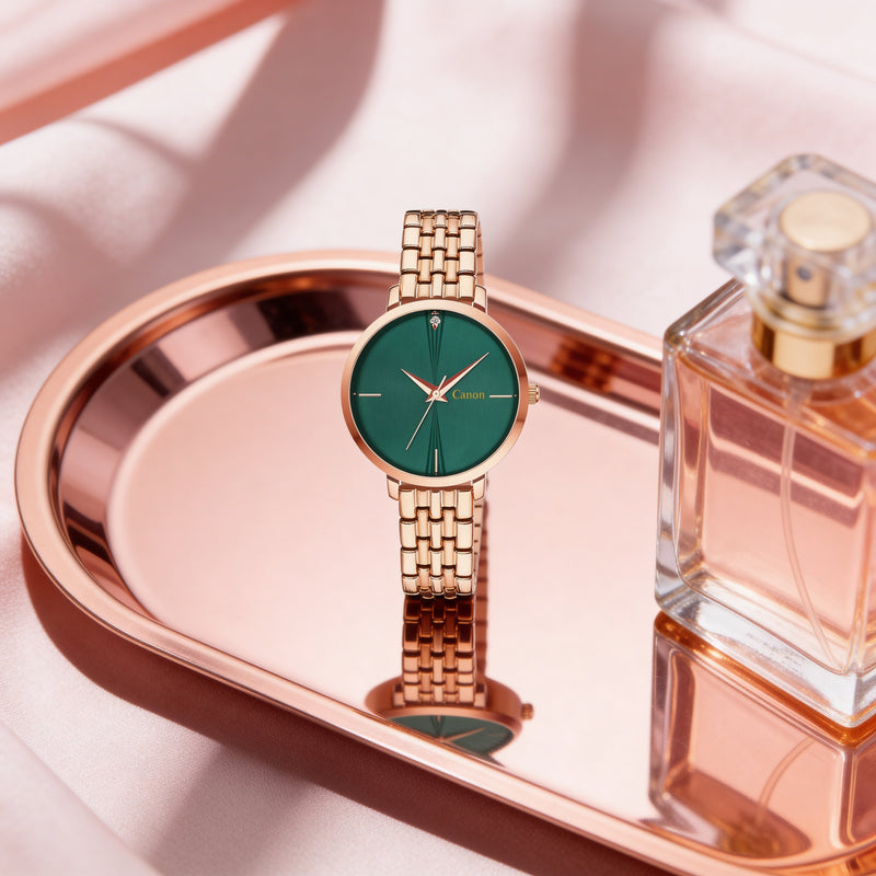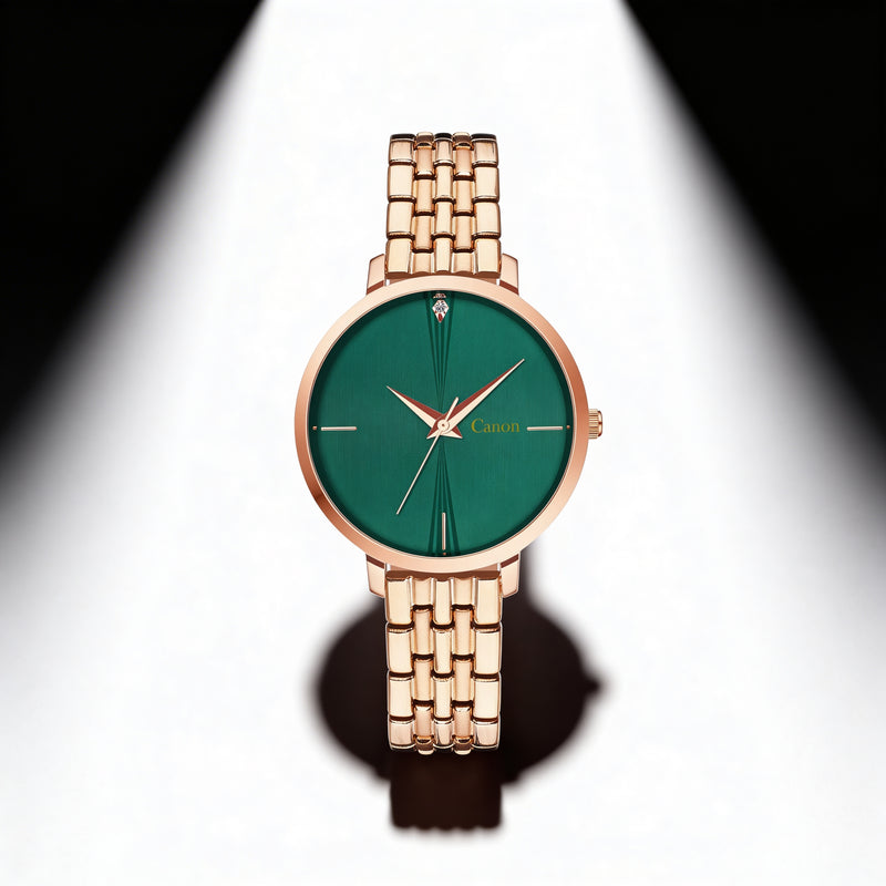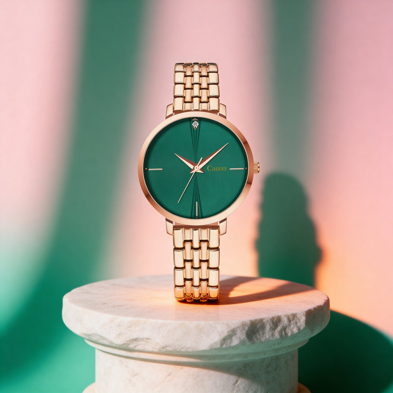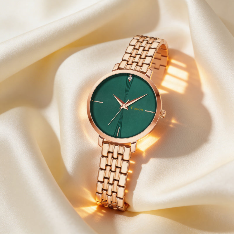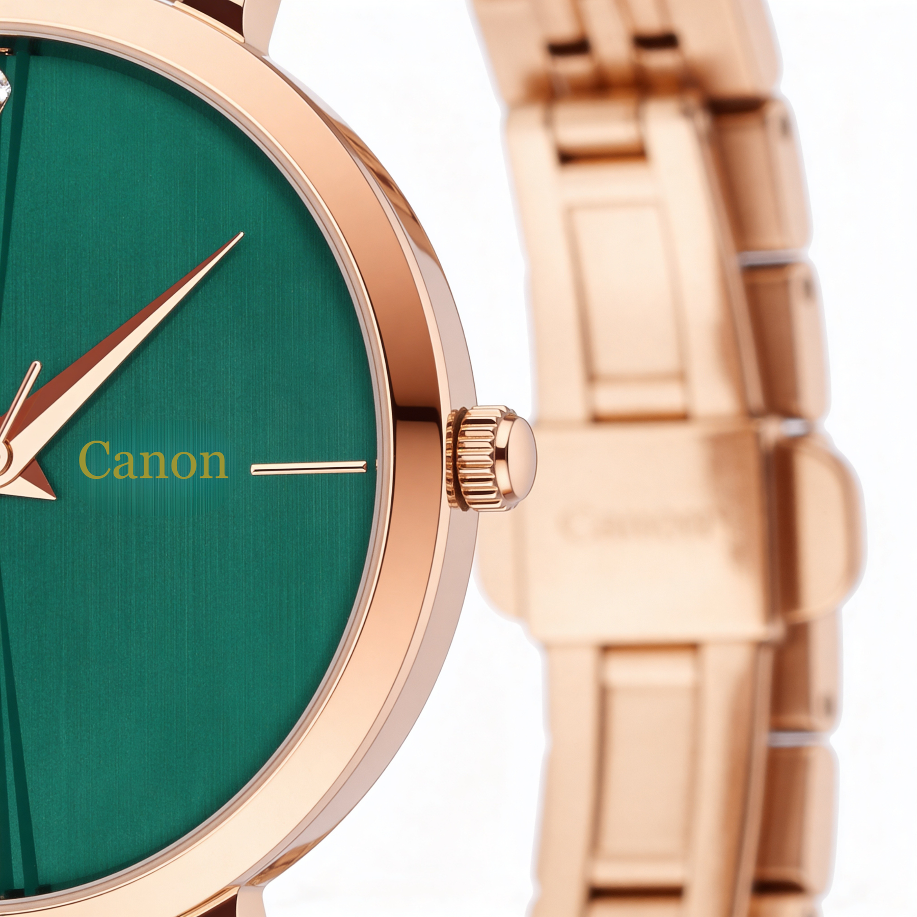 The Canon Quartz Emerald Green Dial Rose Gold Luxury Watch is made for women who want elegance with a richer and more distinctive touch. Its deep emerald green dial paired with the warm rose gold case and bracelet creates a refined look that feels graceful, modern, and luxurious.
