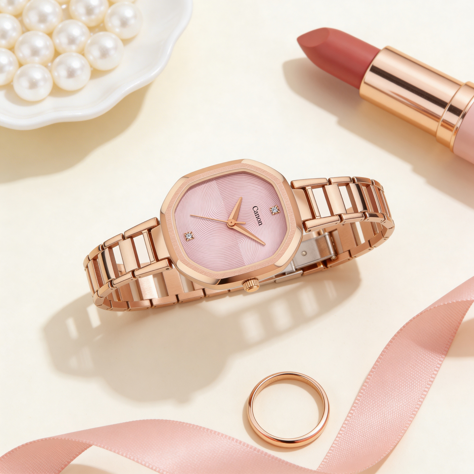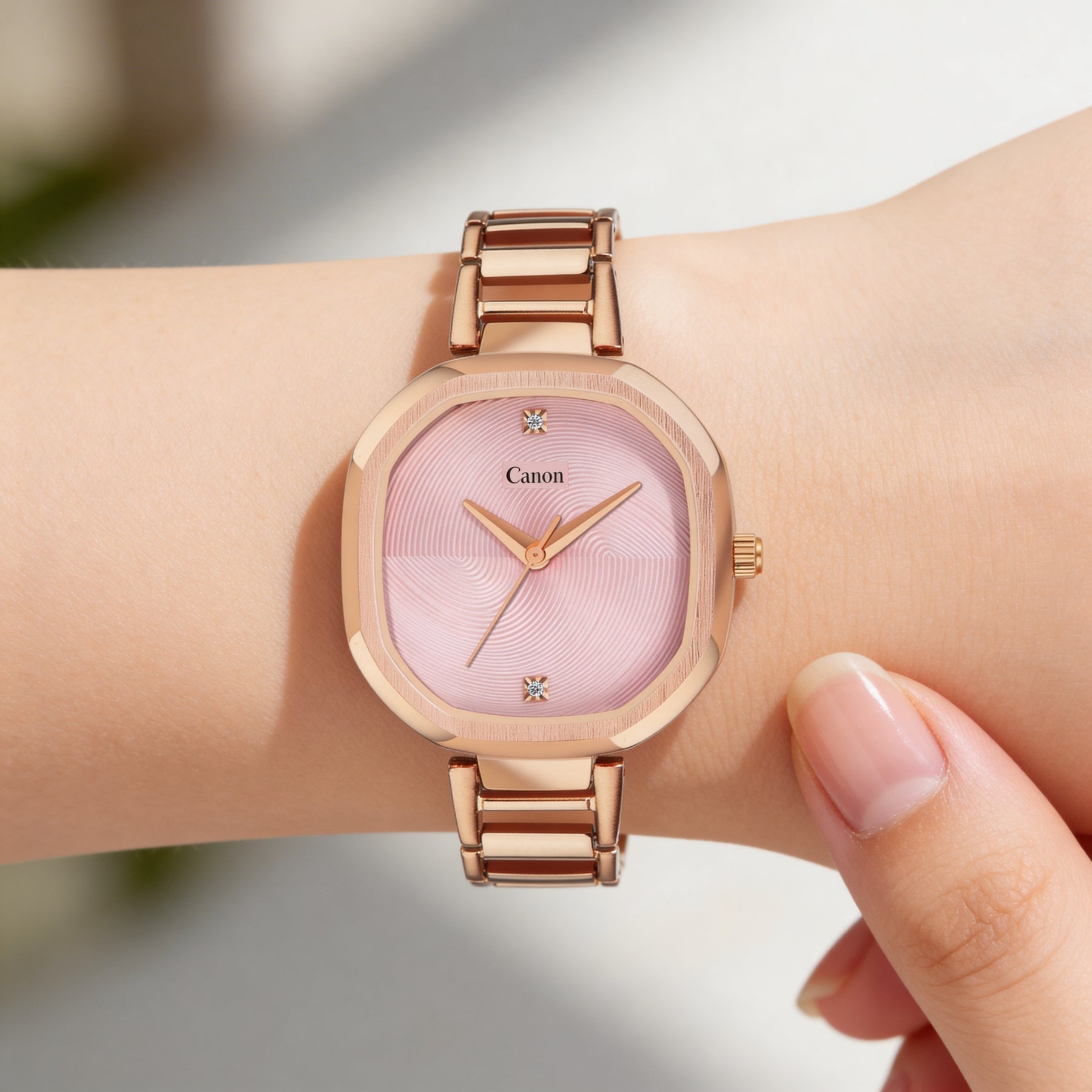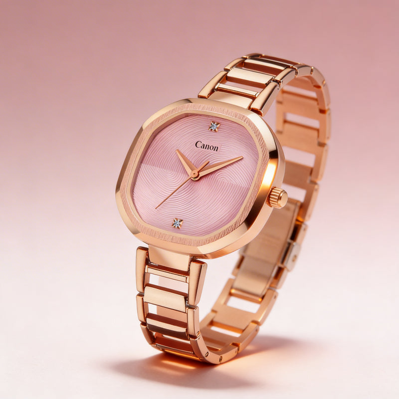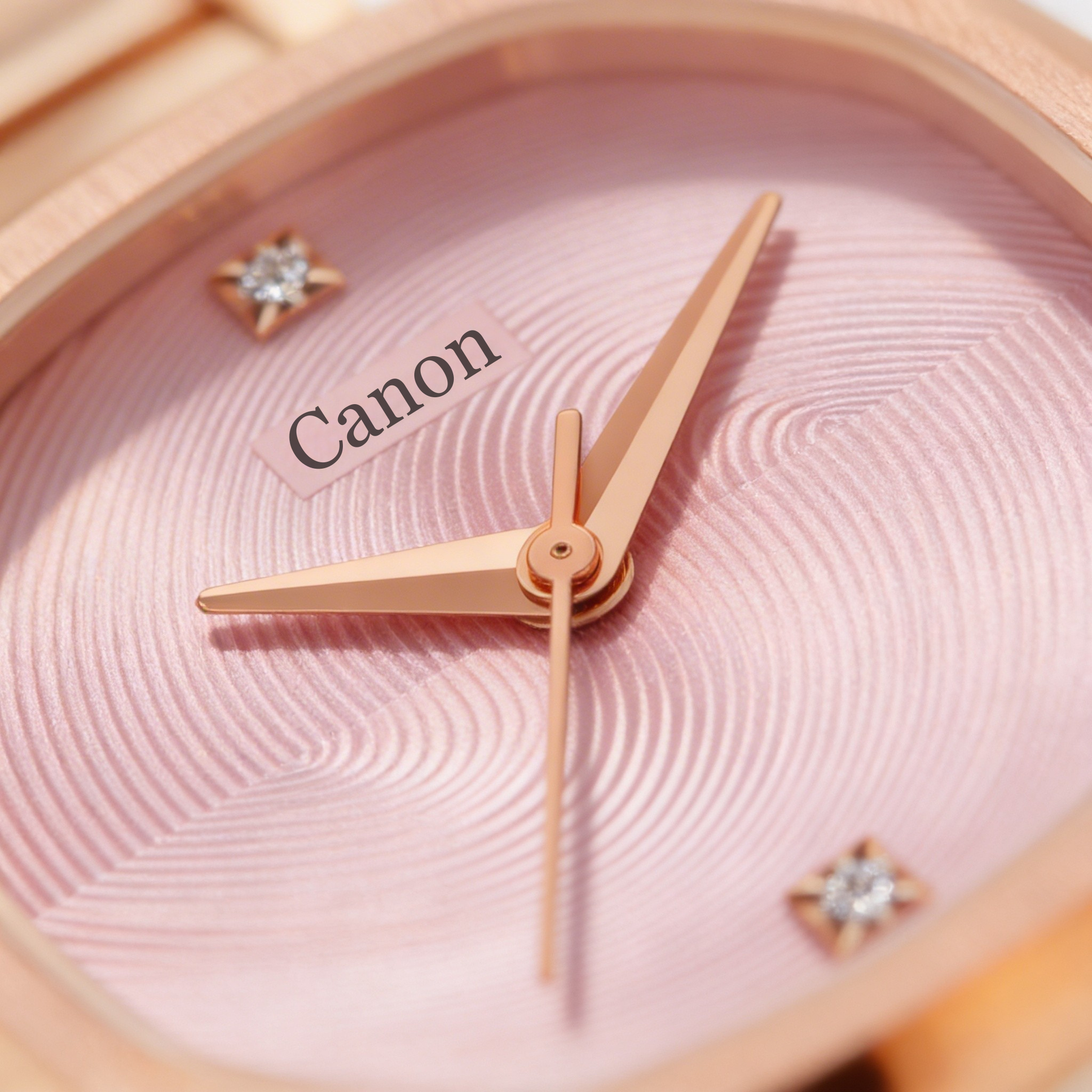 Rose gold Canon wristwatch with pink textured dial and crystal hour markers, 38mm by 35mm