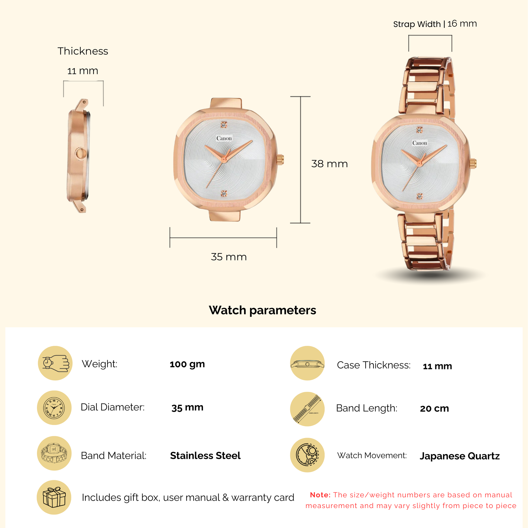 Rose gold wristwatch with silver textured dial, Canon logo, and linked metal bracelet