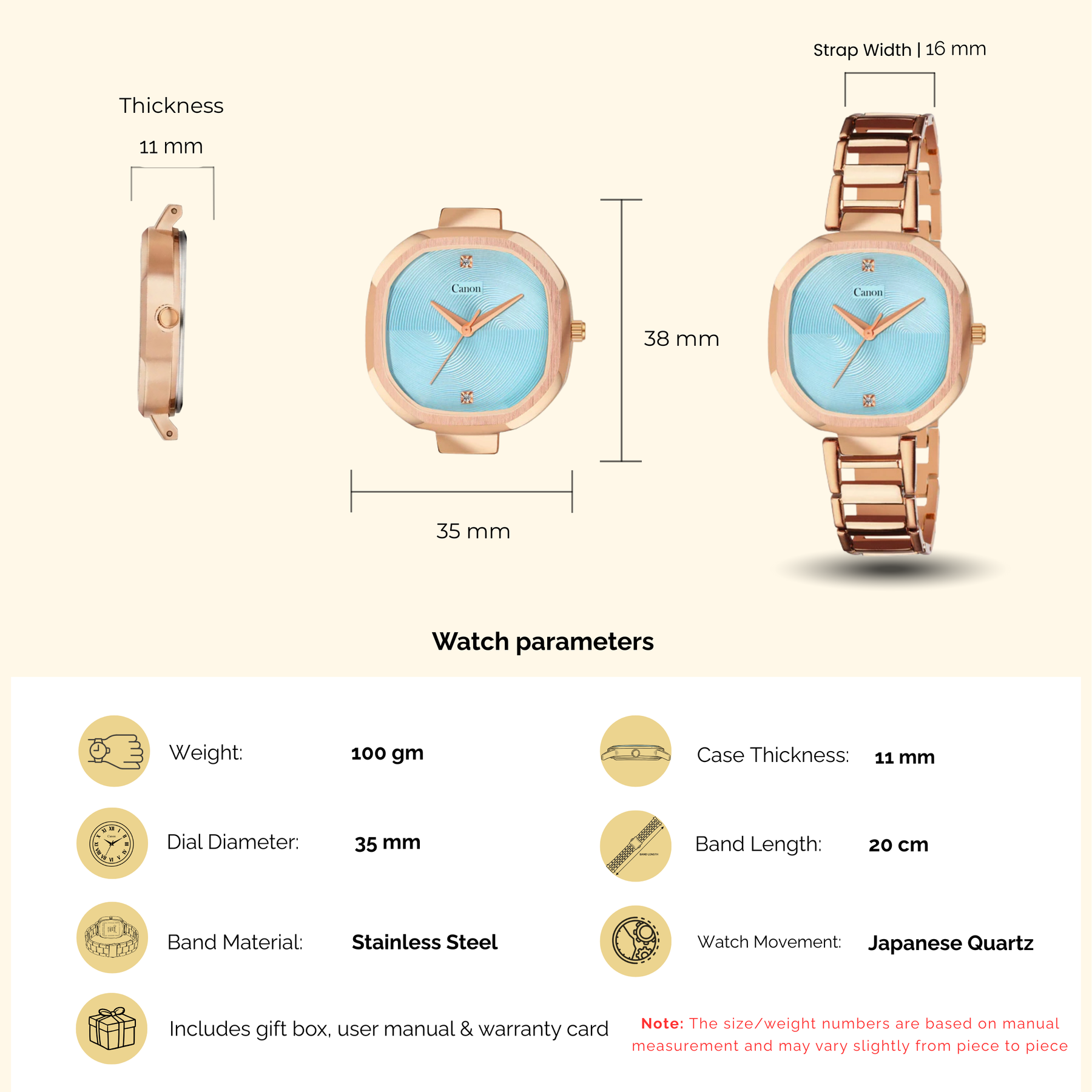 Rose gold watch with light blue textured dial, diamond markers, 35x38mm size