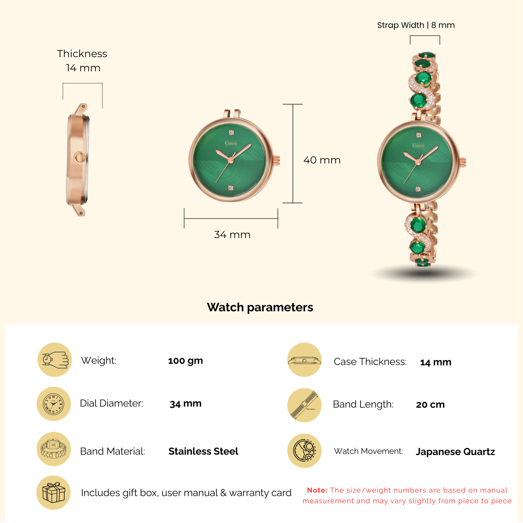 This captivating timepiece from Canon Quartz is a stunning expression of festive glamour. It showcases a mesmerizing emerald green dial, which features a sophisticated guilloché-style texture that plays with the light. The polished rose gold-tone brass case provides a warm frame, while the true highlight is the unique stainless steel bracelet, adorned with vibrant green stones and sparkling pavé crystals in an elegant, flowing design. Powered by a precise Japanese quartz movement, this watch ensures accurate timekeeping and reliable performance for all your special occasions. Designed for the modern woman, this luxurious timepiece is the perfect accessory for weddings, festive celebrations, and grand evening events.