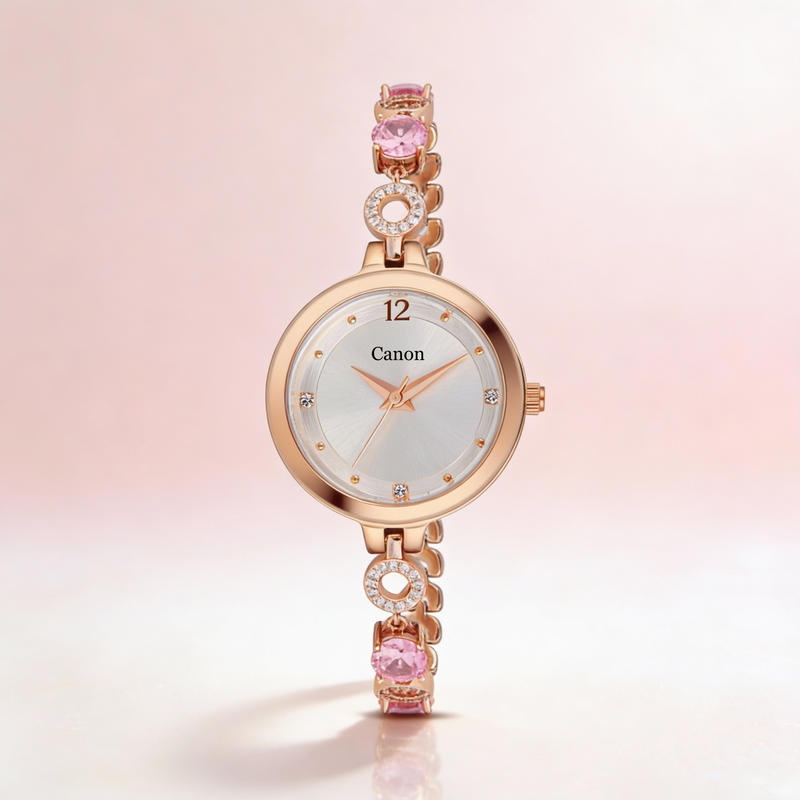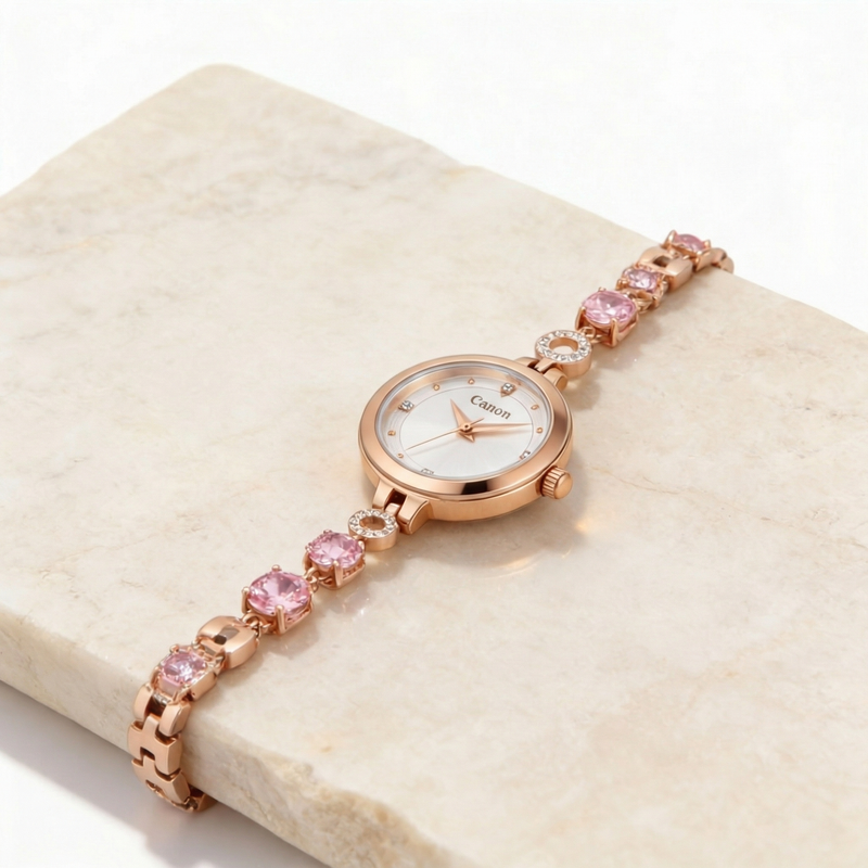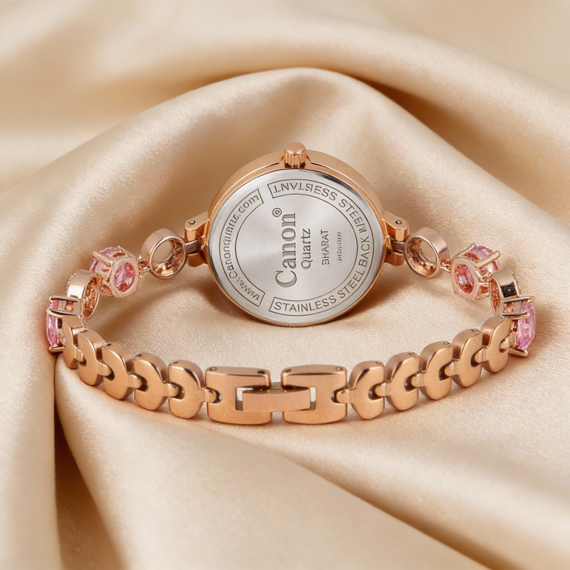 Rose gold chain wristwatch with pink stones, stainless steel back showing Canon Quartz branding