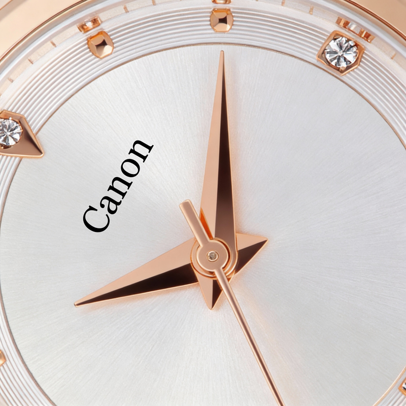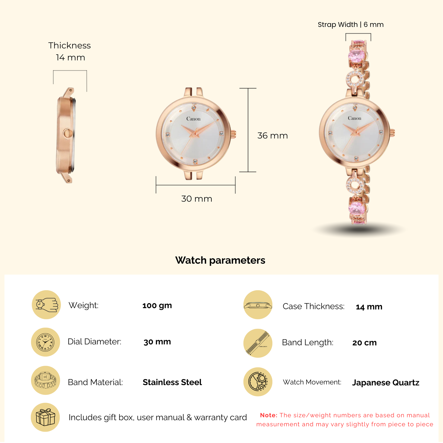 Canon rose gold watch dial with crystal markers, silver face, 30mm width, 36mm height