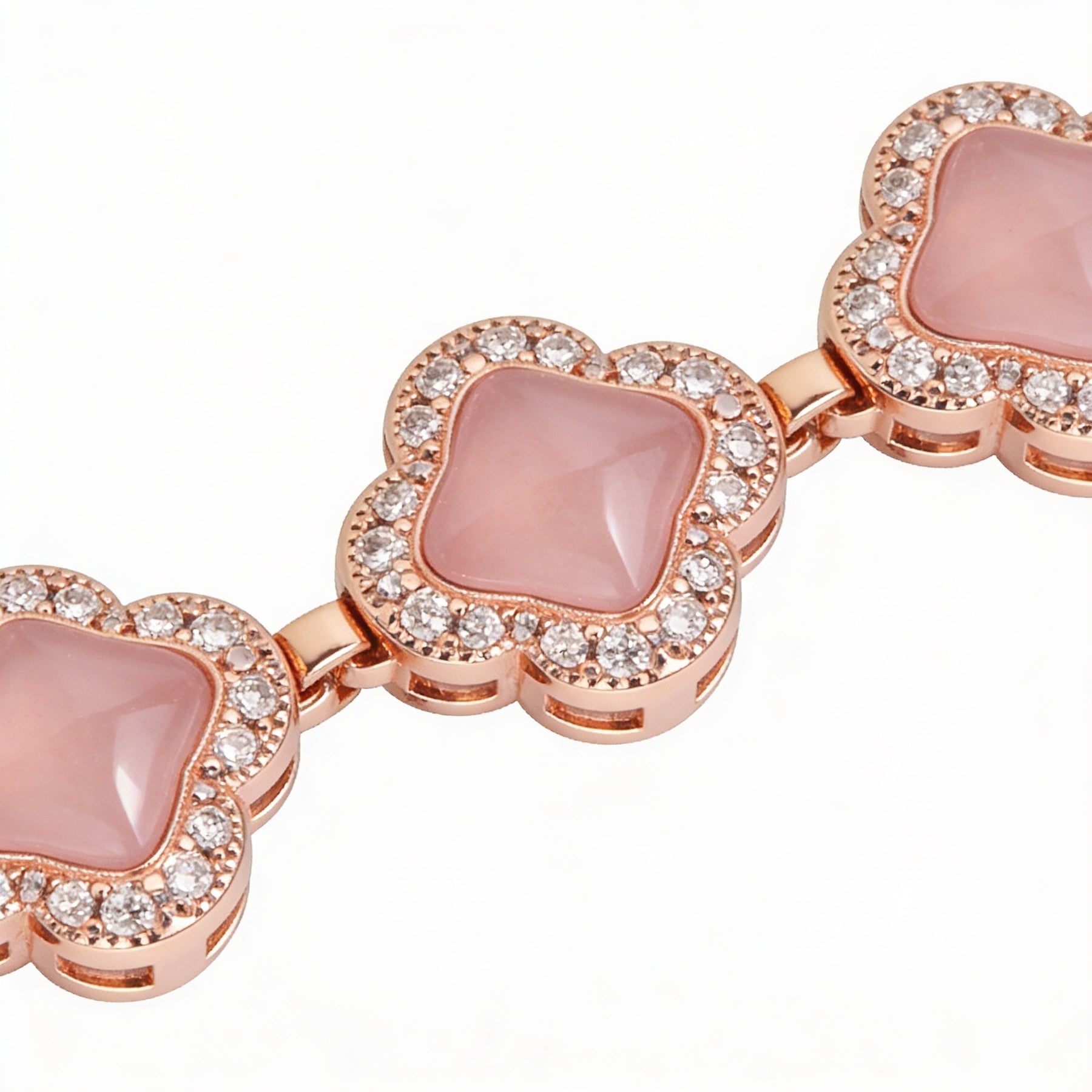 Jewellery Link Bracelet: Stunning clover-style links featuring soft pink stones. Each stone is encircled by a radiant crystal halo, adding sparkle and luxury. The pink stones play beautifully against the rose gold tone.